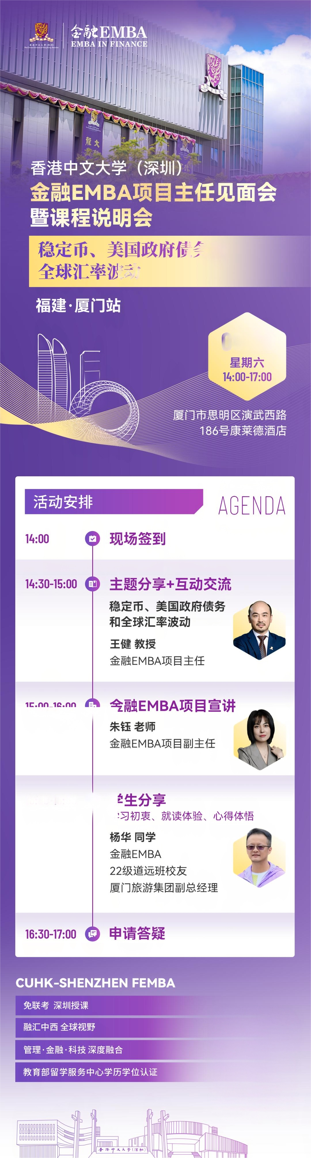 9月20日,香港中文大學(xué)(深圳)金融EMBA項目主任見面會暨課程說明會廈門站重磅開啟!與智者同行,洞見未來金融新圖景。